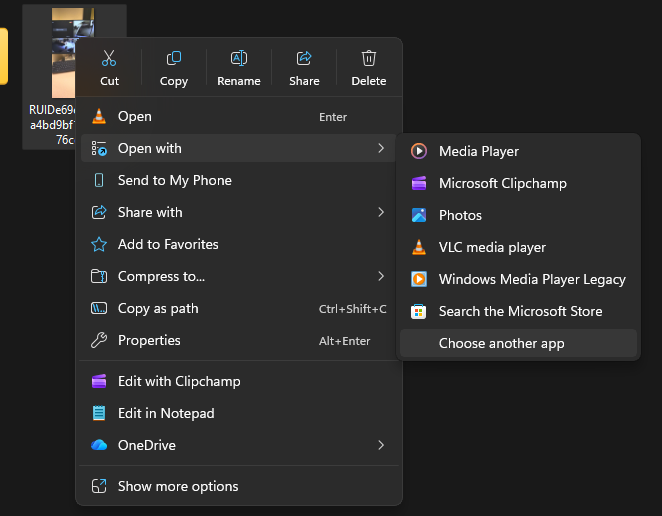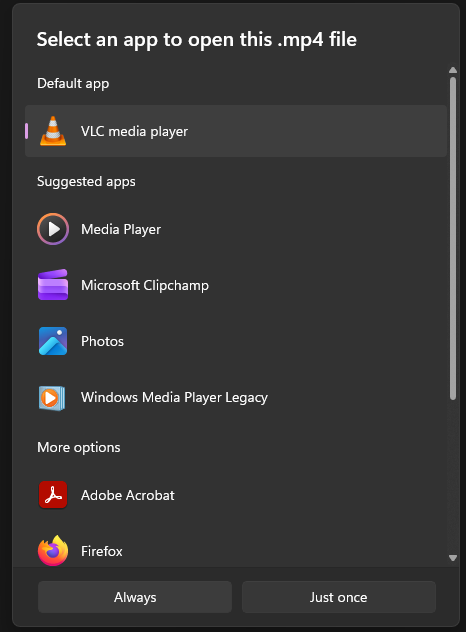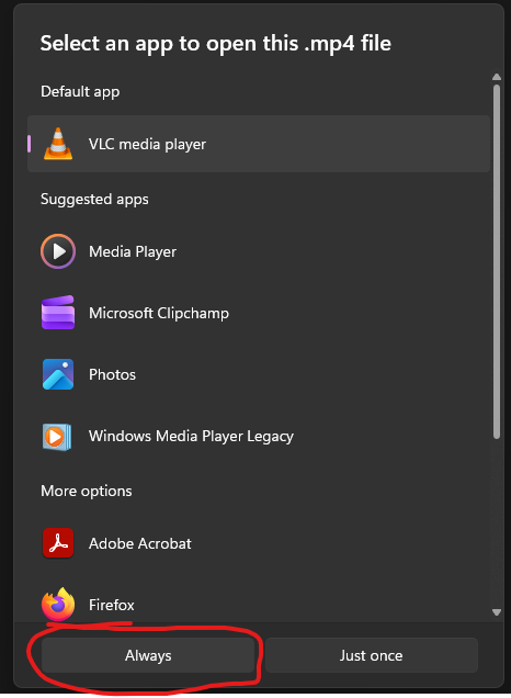 - Click the box for Always use this app to open *.mp4 (depending on the file type).