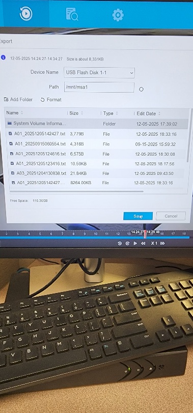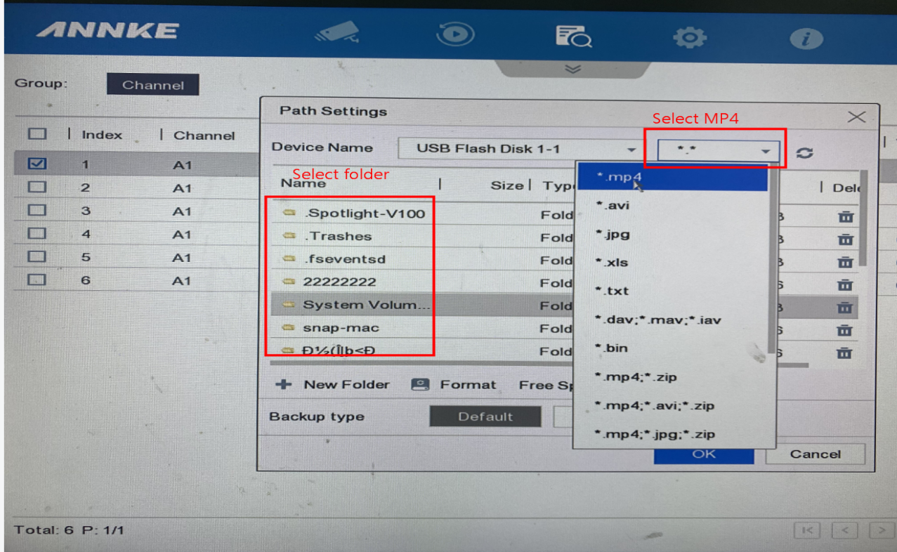 4. When your USB recognized by the system it will show the files on your USB stick, choose the Save Type and folder, click Video and log, Click OK to back up the recording.