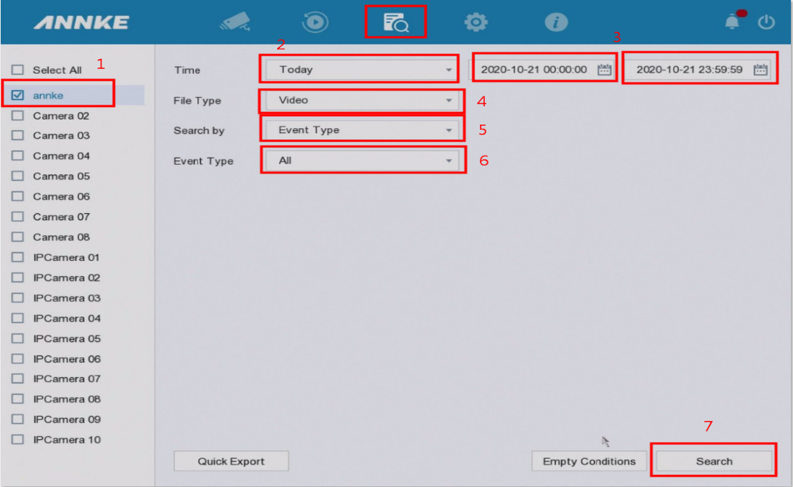 2. Go to Menu-->Search to choose the Channel, Date, Start time, End time, File type, Search type, and Event type. Click to search the file.